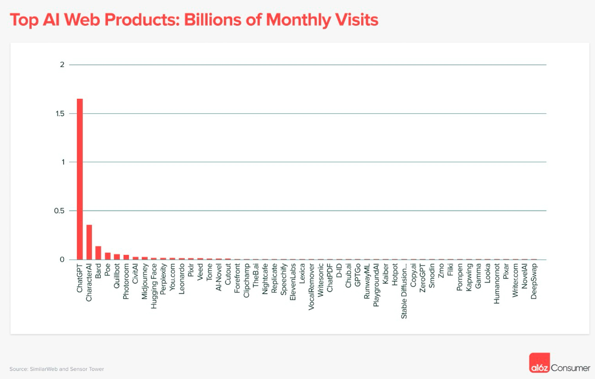 CharacterAI, with ~21% of the scale of ChatGPT, is one of the strongest early players—with DAUs rivaling ChatGPT, and significantly better retention, according to Sensor Tower data.